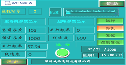 在觸摸屏主界面上,實時顯示當(dāng)前通訊變頻器的各項主要參數(shù),和當(dāng)前狀態(tài),分為:停機、運行、故障等多檔指示。同時利用棒圖元件形象直觀地實時顯示了當(dāng)前絡(luò)筒機的長度參數(shù)。